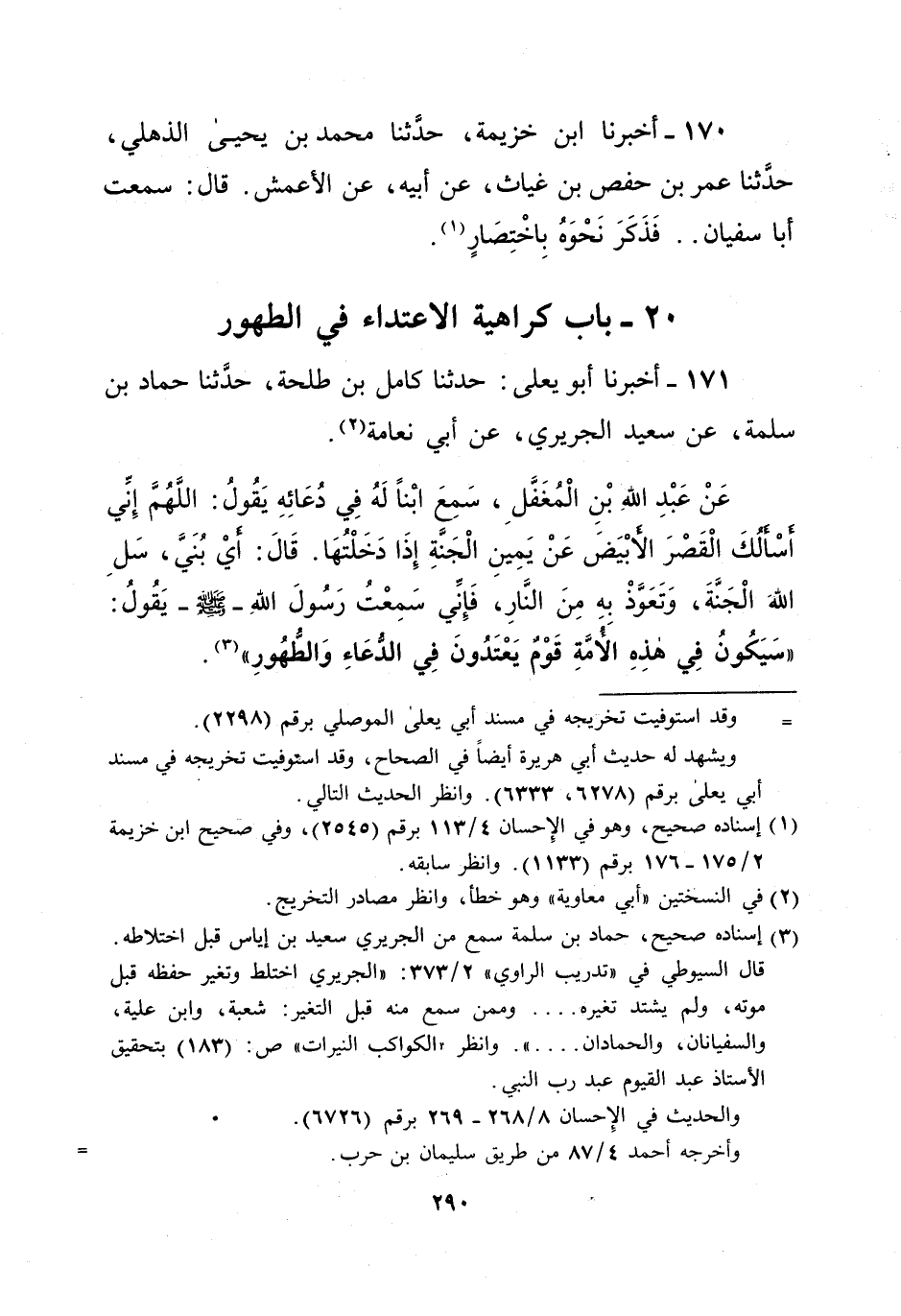 عَنْ عَبْدِ الله بْنِ الْمُغَفَّلِ، سَمِعَ اثناً لَهُ فِي دُعَائِهِ يَقُولُ: اللَّهُمَّ إِنِّي أَسْالُكَ الْقَصْرَ الأبْيَضَ عَنْ يَمِينِ الْجَنَّةِ إِذَا دَخَلْتُهَا. قَالَ: أَيْ بُنَيَّ، سَلِ الله الْجَنَّةَ، وَتَعَوَّذْ بِهِ مِنَ النَّارِ، فَإِنِّي سَمِعْتُ رَسُولَ الله - صلى الله عليه وسلم - يَقُولُ: "سَيَكُونُ فِي هذِهِ الأمَّةِ قَوْمٌ يَعْتَدُونَ فِي الدُّعَاءِ وَالطُّهُورِ" (¬3).