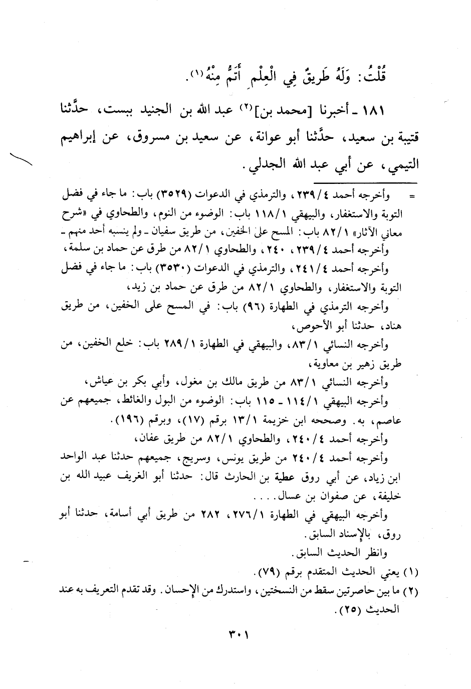 181 - أخبرنا [محمد بن] (¬2) عبد الله بن الجنيد ببست، حدَّثنا قتيبة بن سعيد، حدَّثنا أبو عوانة، عن سعيد بن مسروق، عن إبراهيم التيمي، عن أبي عبد الله الجدلي.