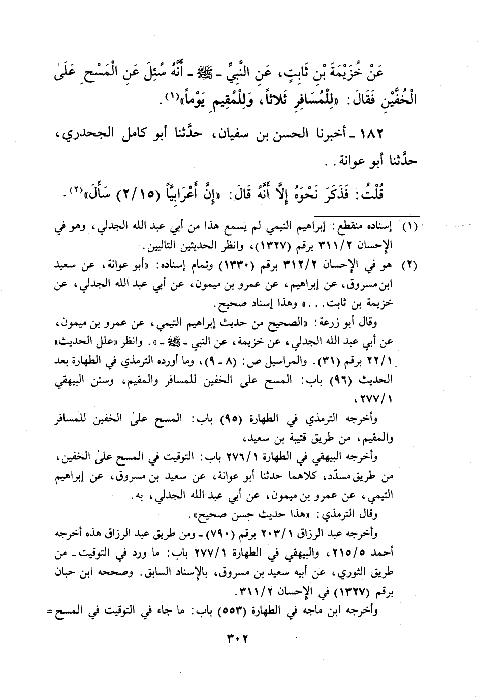(¬2) هو في الإحسان 2/ 312 برقم (1330) وتمام إسناده: "أبو عوانة، عن سعيد ابن مسروق، عن إبراهيم، عن عمرو بن ميمون، عن أبي عبد الله الجدلي، عن خزيمة بن ثابت ... " وهذا إسناد صحيح.
