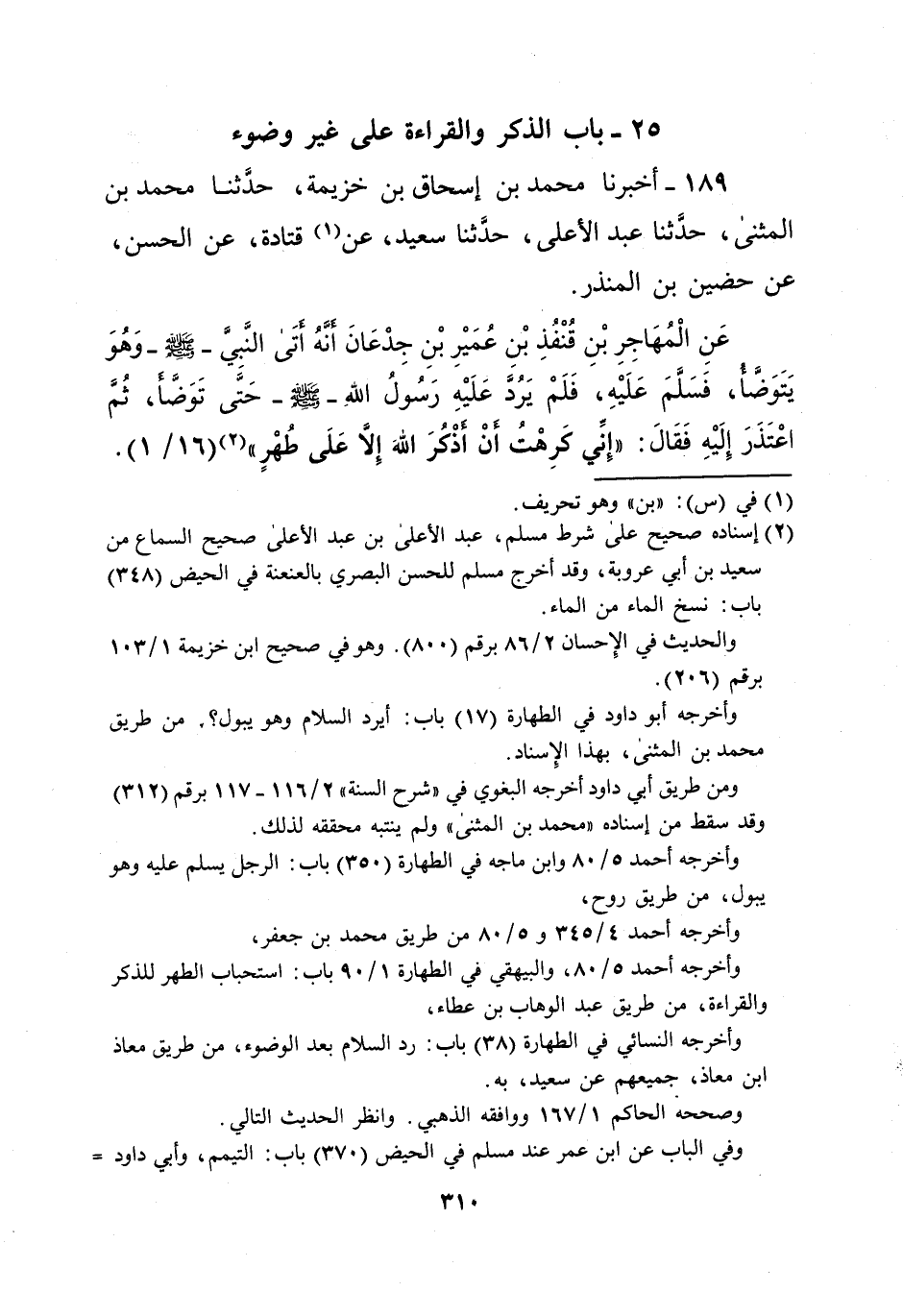 189 - أخبرنا محمد بن إسحاق بن خزيمة، حدَّثنا محمد بن المثنى، حدَّثنا عبد الأعلى، حدَّثنا سعيد، عن (¬1) قتادة، عن الحسن، عن حضين بن المنذر.