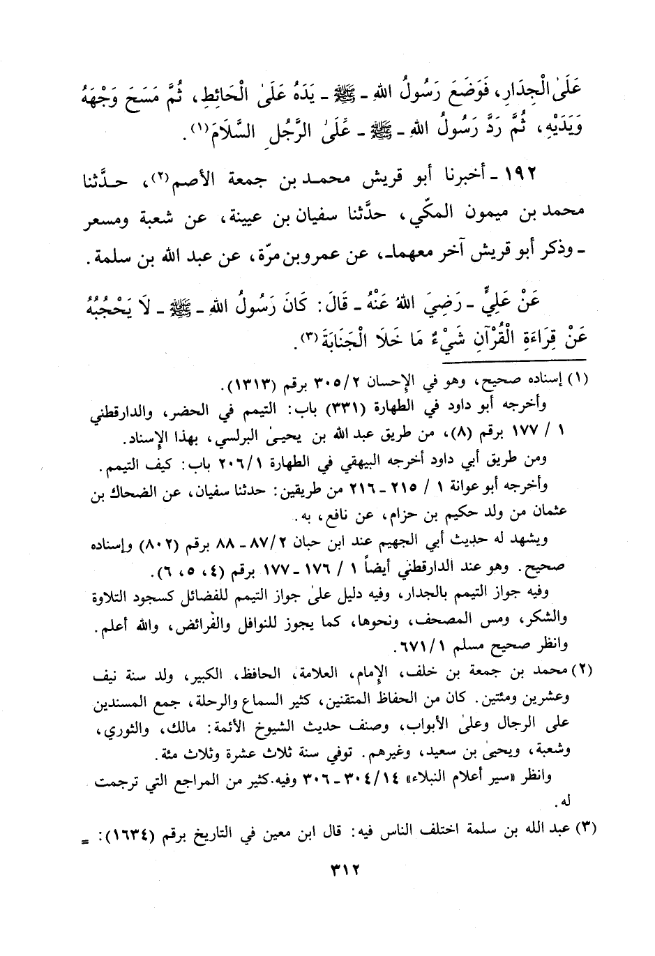 192 - أخبرنا أبو قريش محمد بن جمعة الأصم (¬2)، حدَّثنا محمد بن ميمون المكّي، حدَّثنا سفيان بن عيينة، عن شعبة ومسعر - وذكر أبو قريش آخر معهما-، عن عمرو بن مرّة، عن عبد الله بن سلمة. عَنْ عَلِيٍّ -رَضِيَ اللهُ عَنْهُ- قَالَ: كَانَ رَسُولُ اللهِ - صلى الله عليه وسلم -لا يَحْجُبُهُ عَنْ قِرَاءَةِ الْقُرْآنِ شَيْءٌ مَا خَلاَ الجنابة (¬3).