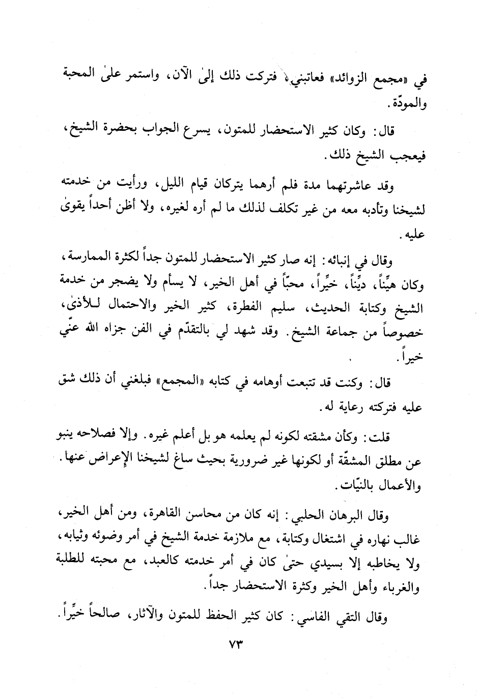 في "مجمع الزوائد" فعاتبني فتركت ذلك إلى الآن، واستمر على المحبة والمودّة. قال: وكان كثير الاستحضار للمتون، يسرع الجواب بحضرة الشيخ، فيعجب الشيخ ذلك. وقد عاشرتهما مدة فلم أرهما يتركان قيام الليل، ورأيت من خدمته لشيخنا وتأدبه معه من غير تكلف لذلك ما لم أره لغيره، ولا أظن أحداً يقوى عليه.