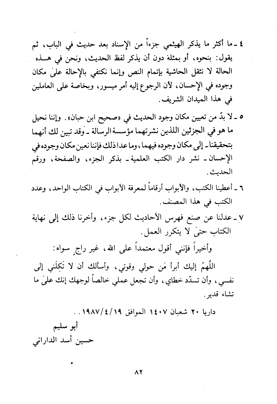 4 - ما أكثر ما يذكر الهيثمي جزءاً من الإِسناد بعد حديث في الباب، ثم يقول: بنحوه، أو بمثله دون أن يذكر لفظ الحديث، ونحن في هذه الحالة لا نثقل الحاشية بإتمام النص وإنما نكتفي بالإِحالة على مكان وجوده في الإِحسان، لأن الرجوع إليه أمر ميسور، وبخاصة على العاملين في هذا الميدان الشريف.