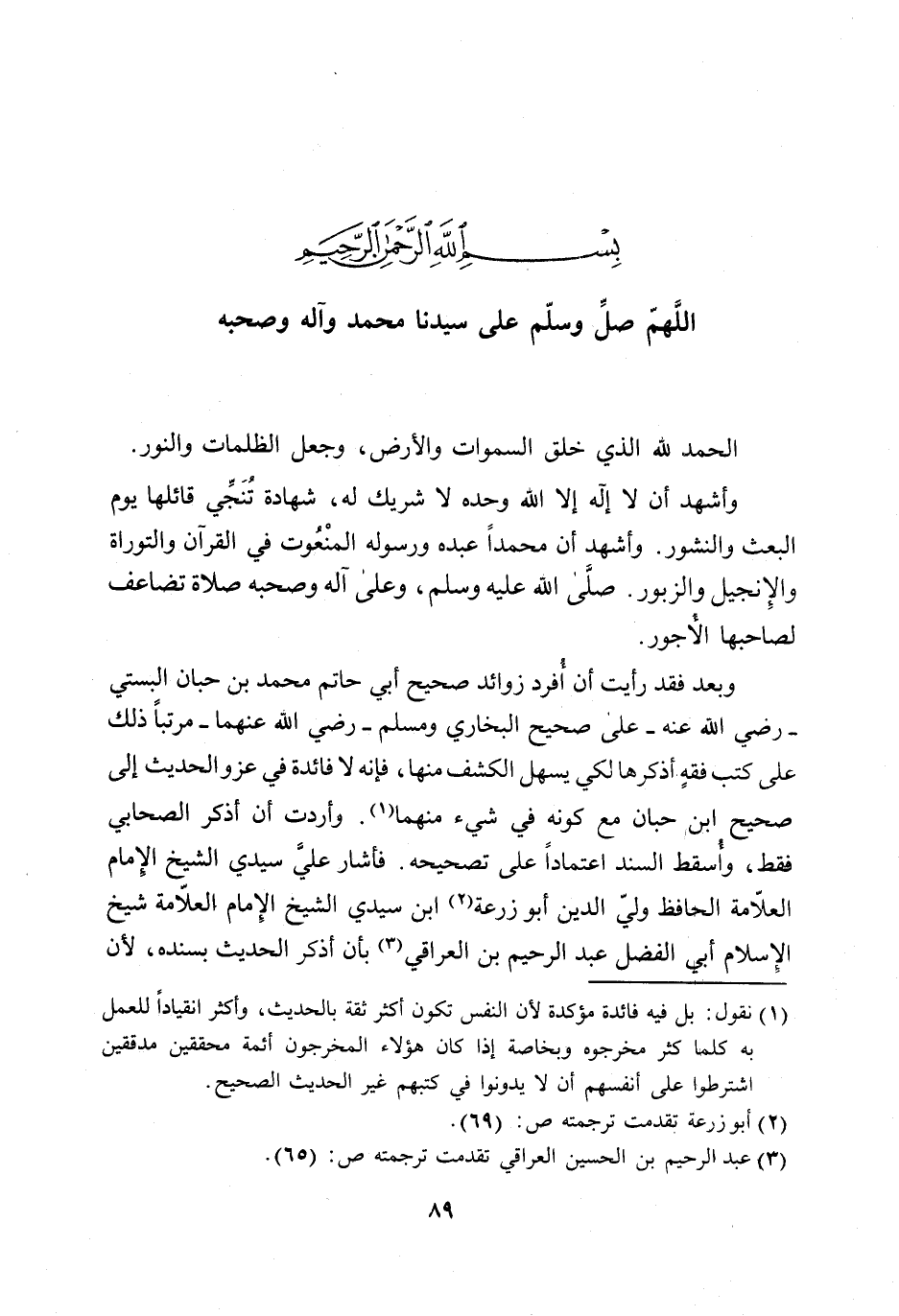 وبعد فقد رأيت أن أُفرد زوائد صحيح أبي حاتم محمد بن حبان البستي -رضي الله عنه- على صحيح البخاري ومسلم -رضي الله عنهما- مرتباً ذلك على كتب فقهٍ أذكرها لكي يسهل الكشف منها، فإنه لا فائدة في عزو الحديث إلى صحيح ابن حبان مع كونه في شيء منهما (¬1). وأردت أن أذكر الصحابي فقط، وأسقط السند اعتماداً على تصحيحه. فأشار عليَّ سيدي الشيخ الإمام العلاّمة الحافظ وليّ الدين أبو زرعة (¬2) ابن سيدي الشيخ الإِمام العلاّمة شيخ الإِسلام أبي الفضل عبد الرحيم بن العراقي (¬3) بأن أذكر الحديث بسنده، لأن