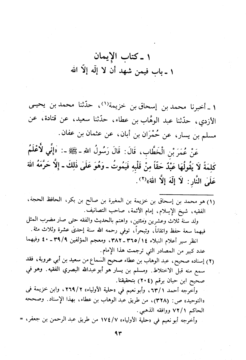 1 - أخبرنا محمد بن إسحاق بن خزيمة (¬1)، حدّثنا محمد بن يحيى الأزدي، حدّثنا عبد الوهَّاب بن عطاء، حدّثنا سعيد، عن قتادة، عن مسلم بن يسار، عن حُمْرَان بن أبان، عن عثمان بن عفان. عَنْ عُمَرَ بْنِ الْخَطَّابِ، قَالَ: قَالَ رَسُولُ اللهِ - صلى الله عليه وسلم -: "إِنِّي لأعْلَمُ كلِمَةً لا يَقُولُهَا عَبْدٌ حَقّاً مِنْ قَلْبِهِ فَيَمُوتُ- وَهُوَ عَلَى ذلِكَ- إِلَّا حَرَّمَهُ اللهُ عَلَى النَّارِ: لا إلهَ إلاّ اللهُ" (¬2).
