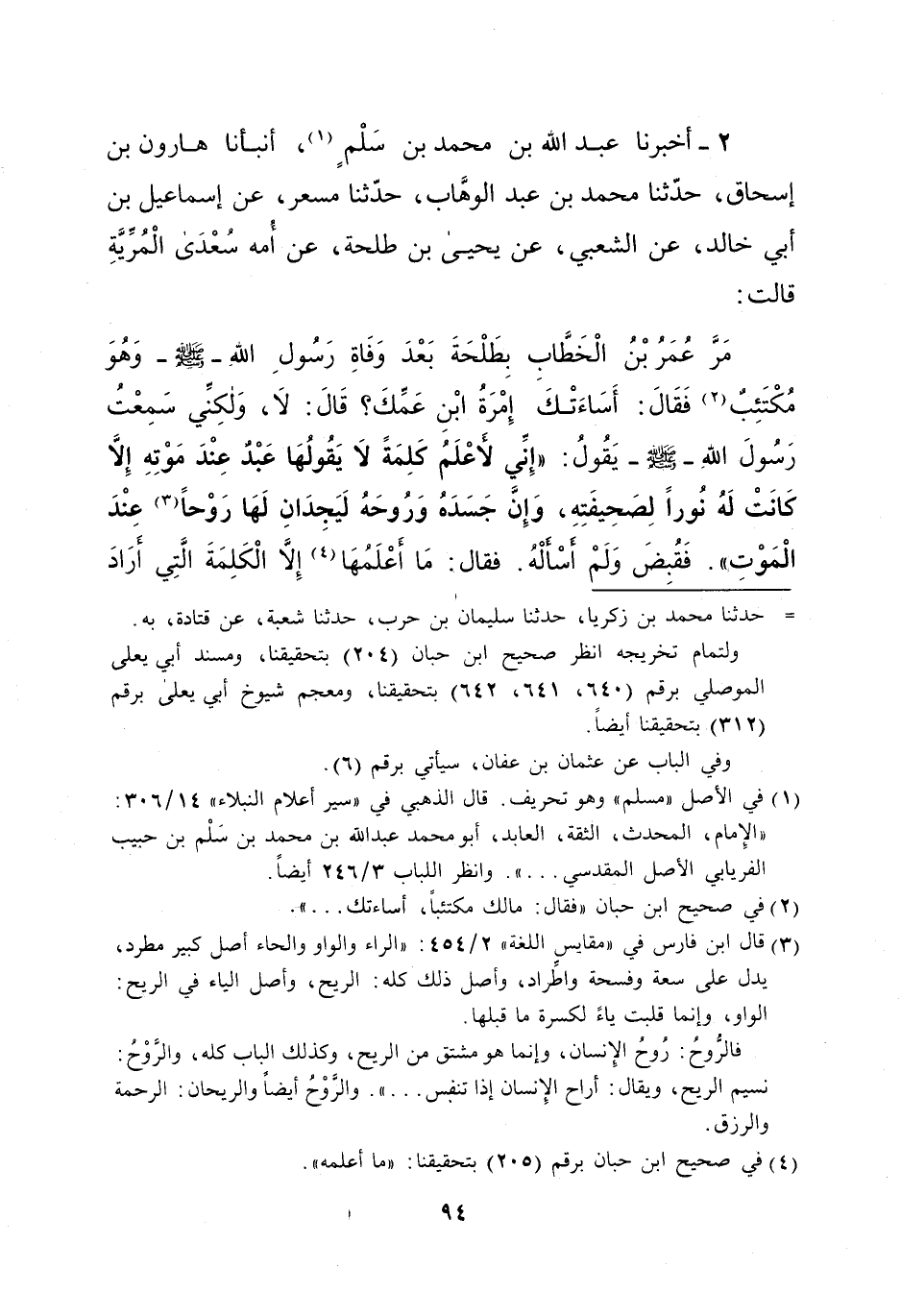 مَرَّ عُمَرُ بْنُ الْخَطَاب بِطَلْحَةَ بَعْدَ وَفَاةِ رَسُولِ اللهِ - صلى الله عليه وسلم - وَهُوَ مُكْتَئِبٌ (¬2) فَقَالَ: أَسَاءَتْكَ إِمْرَةُ ابْنِ عَمِّكَ؟ قَالَ: لا، وَلكِنِّي سَمِعْتُ رَسُولَ الله - صلى الله عليه وسلم - يَقُولُ: "إِنِّي لأعْلَمُ كَلِمَةً لا يَقُولُهَا عَبْدٌ عِنْدَ مَوْتِهِ إِلا كَانَتْ لَهُ نُوراً لِصَحِيفَتِهِ، وَإِنَ جَسَدَهُ وَرُوحَهُ لَيَجِدَانِ لَهَا رَوْحاً (¬3) عِنْدَ الْمَوْتِ". فَقُبِضَ وَلَمْ أَسْألْهُ. فقال: مَا أَعْلَمُهَا (¬4) إِلا الْكَلِمَةَ الَّتِي أَرَادَ