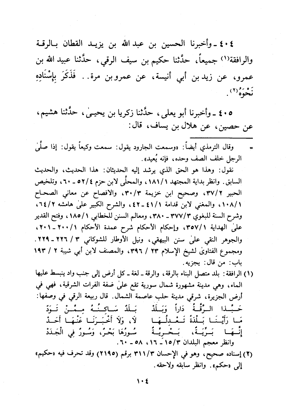 404 - وأخبرنا الحسين بن عبد الله بن يزيد القطان بالرقة والرافقة (¬1) جميعاً، حدَّثنا حكيم بن سيف الرقي، حدَّثنا عبيد الله بن عمرو، عن زيد بن أبي أنيسة، عن عمرو بن مرة .. فَذَكَرَ بِإِسْنَادِهِ نَحْوَهُ (¬2).
