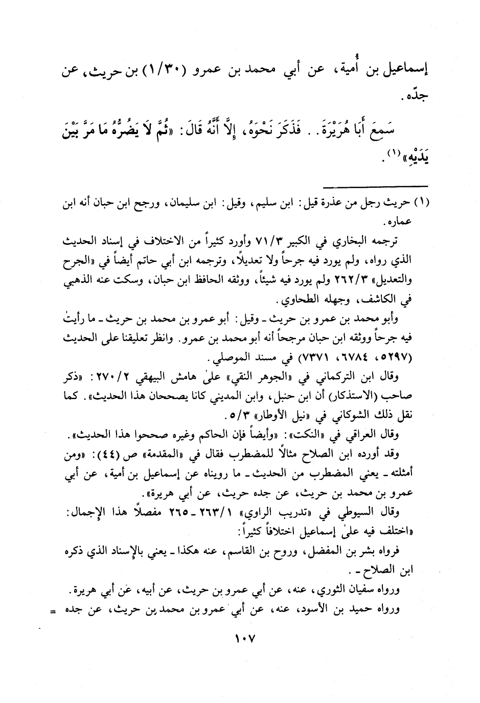 وقال العراقي في "النكت": "وأيضاً فإن الحاكم وغيره صححوا هذا الحديث". وقد أورده ابن الصلاح مثالاً للمضطرب فقال في "المقدمة" ص (44): "ومن أمثلته -يعني المضطرب من الحديث- ما رويناه عن إسماعيل بن أمية، عن أبي عمرو بن محمد بن حريث، عن جده حريث، عن أبي هريرة".