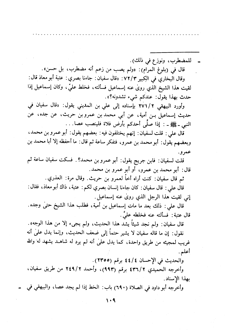 وأورد البيهقي 2/ 271 بإسناده إلى علي بن المديني يقول: "قال سفيان في حديث إسماعيل بن أمية، عن أبي محمد بن عمرو بن حريث، عن جده، عن النبي - صلى الله عليه وسلم -: إذا صلى أحدكم بأرض فلاة فلينصب عصا ...