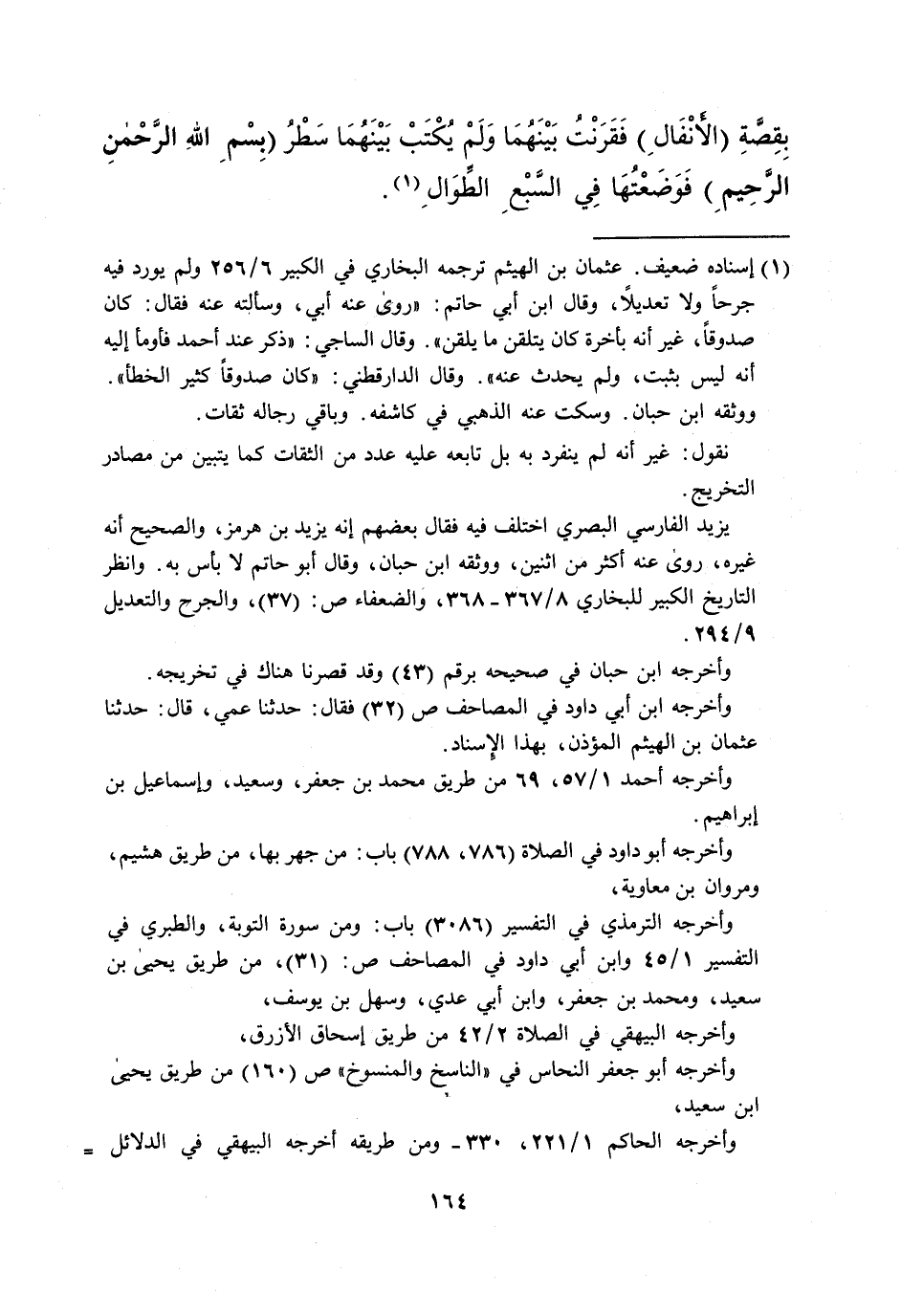 بِقِصَّةِ (الأنْفَالِ) فَقَرَنْتُ بَيْنَهُمَا وَلَمْ يُكْتَبْ بَيْنَهُمَا سَطْرُ (بِسْمِ اللهِ الرَّحْمنِ الرَّحِيمِ) فَوَضَعْتُهَا فِي السَّبْعِ الطَوَالِ (¬1).