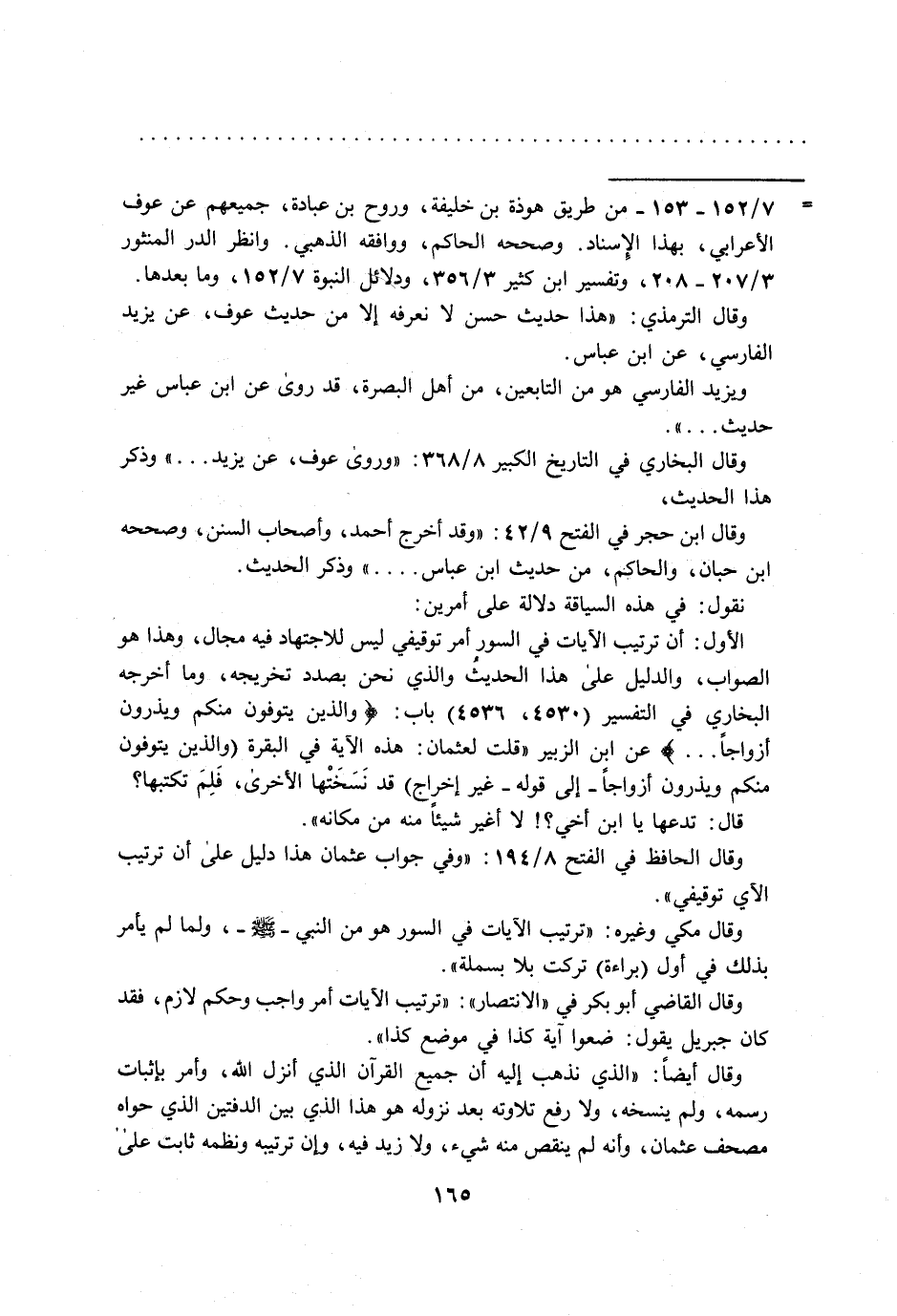وقال الحافظ في الفتح 8/ 194: "وفي جواب عثمان هذا دليل على أن ترتيب الأي توقيفي".