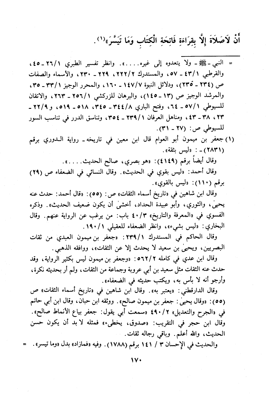 أنْ لاصَلاَةَ إِلاَّ بِقِرَاءَةِ فَاتِحَةِ الْكِتَابِ وَمَا تَيَسرَ" (¬1)