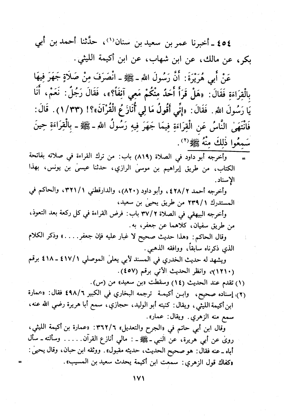 454 - أخبرنا عمر بن سعيد بن سنان (¬1)، حدَّثنا أحمد بن أبي بكر، عن مالك، عن ابن شهاب، عن ابن أكيمة الليثي.