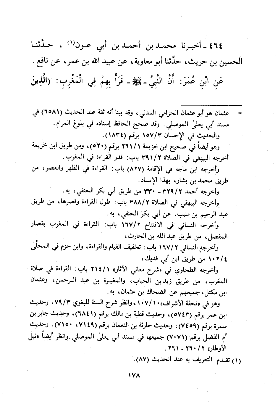 464 - أخبرنا محمد بن أحمد بن أبي عون (¬1)، حدَّثنا الحسين بن حريث، حدَّثنا أبو معاوية، عن عبيد الله بن عمر، عن نافع.
