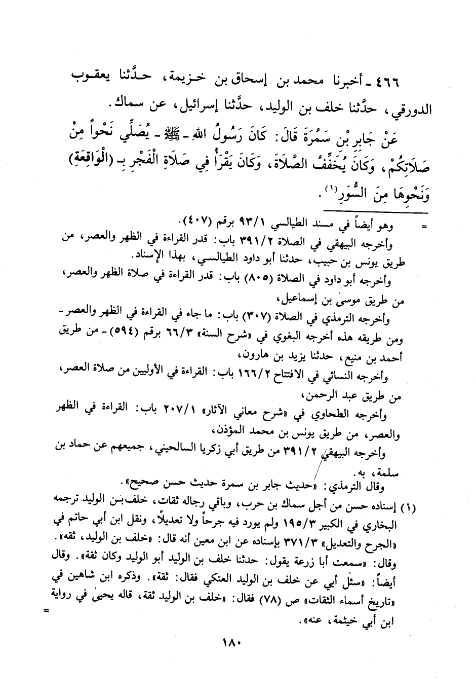466 - أخبرنا محمد بن إسحاق بن خزيمة، حدَّثنا يعقوب الدورقي، حدَّثنا خلف بن الوليد، حدَّثنا إسرائيل، عن سماك. عَنْ جَابِرِبْنِ سَمُرَةَ قَالَ: كَانَ رَسُولُ اللهِ - صلى الله عليه وسلم - يُصَلِّي نَحْواً مِنْ صَلاتِكُمْ، وَكَانَ يُخَفِّفُ الصَّلاةَ، وَكَانَ يَقْرأُ فِي صَلاةِ الْفَجْرِ بِـ (الْوَاقِعَةِ) وَنَحْوِهَا مِنَ السُّوَرِ (¬1).