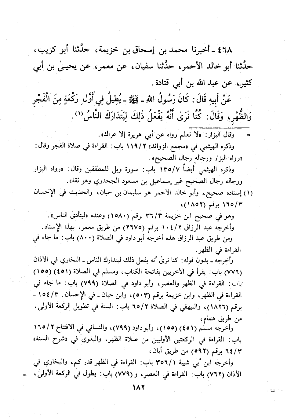 468 - أخبرنا محمد بن إسحاق بن خزيمة، حدَّثنا أبو كريب، حدَّثنا أبو خالد الأحمر، حدَّثنا سفيان، عن معمر؟ عن يحيى بن أبي كثير، عن عبد الله بن أبي قتادة.