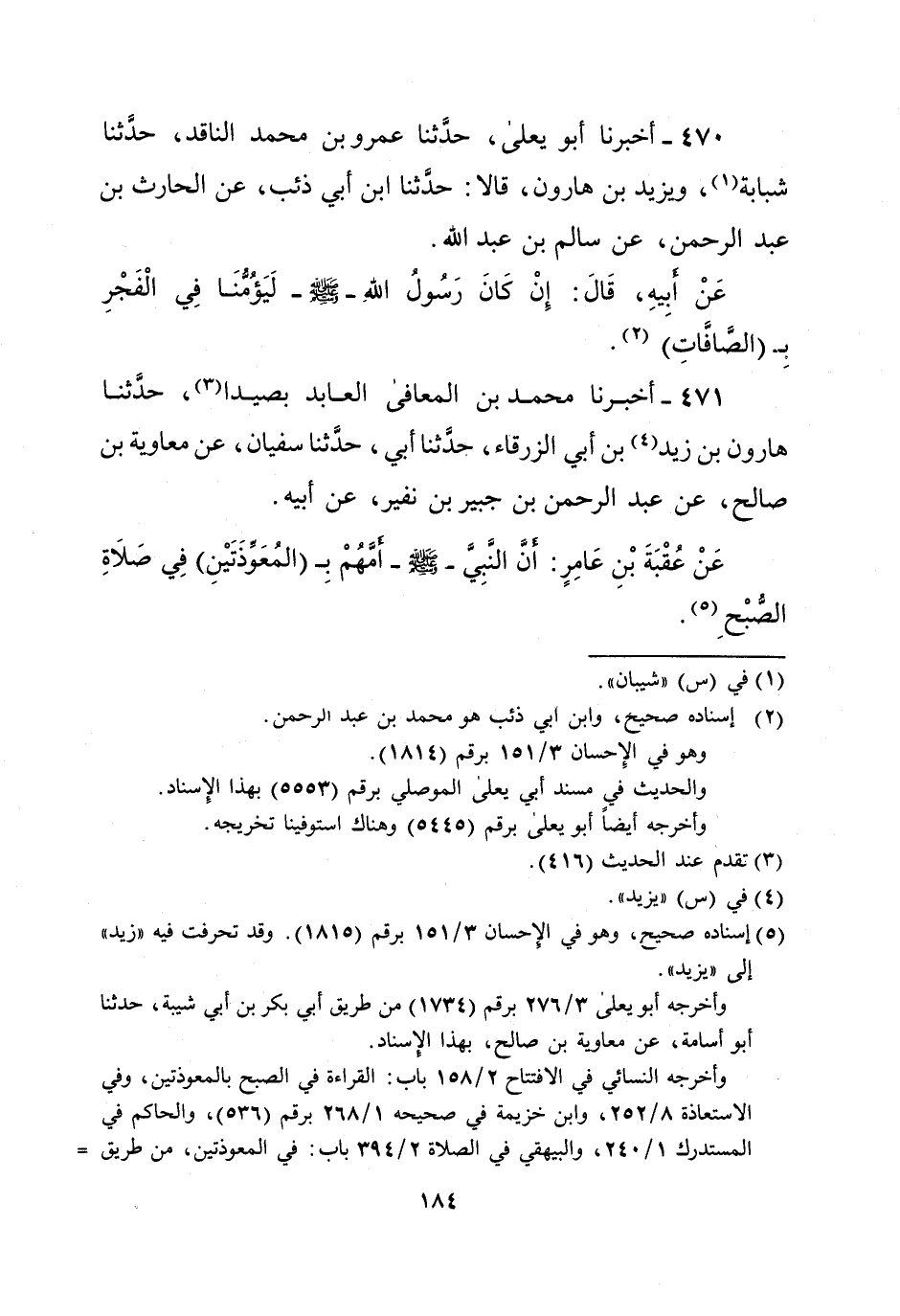 470 - أخبرنا أبو يعلى، حدَّثنا عمرو بن محمد الناقد، حدَّثنا شبابة (¬1)، ويزيد بن هارون، قالا: حدَّثنا ابن أبي ذئب، عن الحارث بن عبد الرحمن، عن سالم بن عبد الله. عَنْ أَبِيهِ، قَالَ: إِنْ كَانَ رَسُولُ اللهِ - صلى الله عليه وسلم - لَيَؤُمُّنَا فِي الْفَجْرِ بِـ (الصَافَاتِ) (¬2).