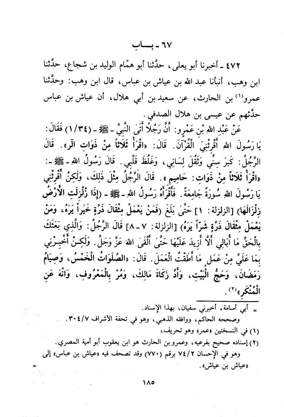 عَنْ عَبْدِ اللهِ بْنِ عَمْرٍو: أنَّ رَجُلاً أَتَى النَّبِيَّ- صلى الله عليه وسلم - (34/ 1) فَقَالَ: يَا رَسُولَ اللهِ أقْرِئْنِيَ الْقُرْآنَ. قَالَ: "اقْرَأ ثَلاثاً مِنْ ذَوَاتِ الر". قَالَ الرَّجُلُ: كَبرَ سِنِّي وَثَقُلَ لِسَانِي، وَغَلُظَ قَلْبِي. قَالَ رَسُولُ اللهِ - صلى الله عليه وسلم -: "اقْرَاْ ثَلاَثاً مِنْ ذَوَاتِ: حَامِيمِ". قَالَ الرَّجُلُ مِثْلَ ذلِكَ، وَلكِنْ أَقْرِئْنِي يَا رَسُولَ اللهِ سُورَةً جَامِعَةً. فَأَقْرأهُ رَسُولُ اللهِ - صلى الله عليه وسلم - {إذَا زُلْزِلَتِ الأرْض زِلْزَالَهَا} [الزلزلة:1] حَتَّى بَلَغَ {فَمَنْ يَعْمَلْ مِثْقَالَ ذَرَّةٍ خيراً يَرَهُ، وَمَنْ يَعْمَلْ مِثْقَالَ ذَرَّةٍ شَرّاً يَرَهُ} [الزلزلة: 7 - 8] قَالَ الرَّجُلُ: وَالَّذِي بَعَثَكَ بِالْحَقِّ مَا أُبَالِي ألاَّ أزِيدَ عَلَيْهَا حَتَّى ألْقَى اللهَ عَزَّ وَجَلَّ. وَلكِنْ أخْبِرْني بِمَا عَلَيَّ مِنْ عَمَلٍ مَا أطَقْتُ الْعَمَلَ. قَالَ: "الصَّلَوَاتُ الْخَمْسُ، وَصِيَامُ رَمَضَانَ، وَحَجُّ الْبَيْتِ، وَأدِّ زَكاةَ مَالِكَ، وَمُرْ بِالْمَعْرُوفِ، وَانْهَ عَنِ الْمُنْكَرِ" (¬2).