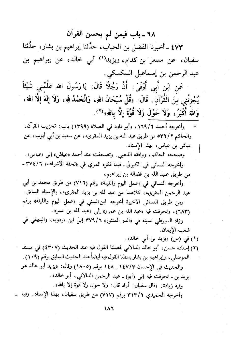 (¬2) إسناده حسن، أبو خاند الدالاني فصلنا القول فيه عند الحديث (4307) في مسند الموصلي، وإبراهيم بن بشار بسطنا القول فيه أيضاً عند الحديث السابق برقم (109). والحديث في الإحسان 3/ 147 - 148 برقم (1805) وقال: "يزيد أبو خالد هو يزيد بن- تحرفت فيه إلى (أبو) - عبد الرحمن الدالاني، أبو خالد". وفيه زيادة: "قال سفيان: أراه قال: ولا حول ولا قوة إلا بالله".