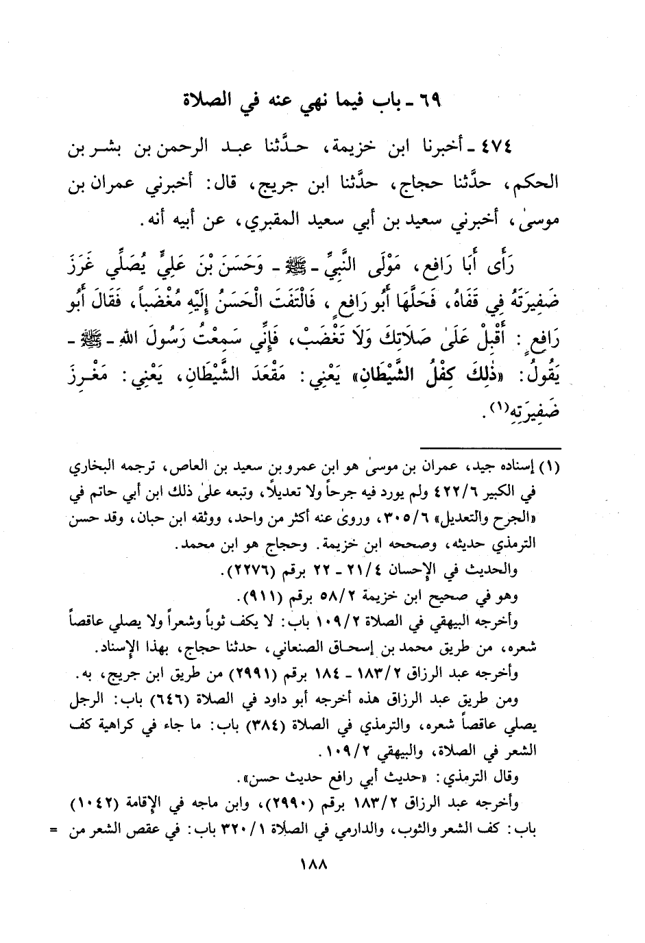 رَأى أبَا رَافع، مَوْلَى النَّبِيِّ- صلى الله عليه وسلم - وَحَسَنَ بْنَ عَلِيٍّ يصلِّي غَرَزَ ضَفِيرَتَهُ فِي قَفَاهُ، فَحَلَّهَا أبُو رَافعٍ، فَالْتَفَتَ الْحَسَنُ إِلَيْهِ مُغْضَباً، فَقَالَ أبُو رَافعٍ-: أَقْبلْ عَلَى صَلاَتِكَ وَلاَ تَغْضَبْ، فَإِنِّي سَمِعْتُ رَسُولَ اللهِ - صلى الله عليه وسلم - يَقُولُ: "ذَلِكَ كِفْلُ الشَّيْطَانِ" يَعْنِي: مَقْعَدَ الشَّيْطَانِ، يَعْنِي: مَغْرِزَ ضَفِيرَتِهِ (¬1).