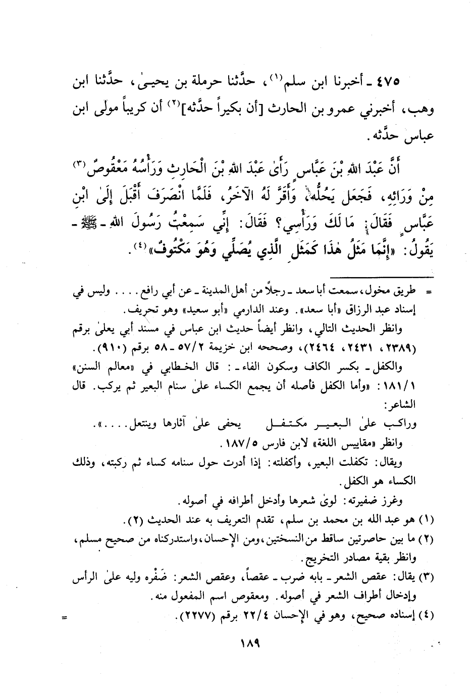 أنَّ عَبْدَ اللهِ بْنَ عَبَّاسٍ رَأى عَبْدَ الله بْنَ الْحَارِثِ وَرَأْسُهُ مَعْقُوصٌ (¬3) مِنْ وَرَائِهِ، فَجَعَل يَحُلُّه، وَأَقَرَّ لَهُ الآخَرُ، فَلَمَّا انْصَرَفَ أَقْبَلَ إِلَى ابْنِ عَبَّاسٍ فَقَالَ مَالَكَ وَرَأْسِي؟ فَقَالَ: إِنِّي سَمِعْتُ رَسُولَ الله - صلى الله عليه وسلم - يَقُولُ: "إِنَّمَا مَثَلُ هذَا كَمَثَلِ الذِي يُصَلِّي وَهُوَ مَكْتُوفٌ" (¬4).