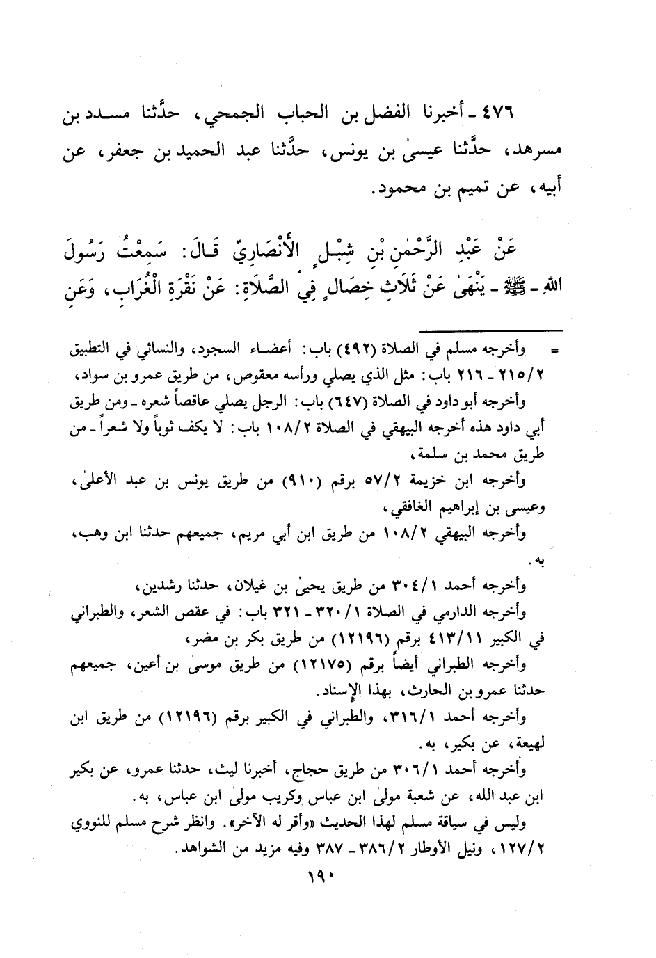 عَنْ عَبْدِ الرَّحْمنِ بْنِ شِبْلٍ الأنْصَارِيّ قَالَ: سَمِعْتُ رَسُولَ اللهِ - صلى الله عليه وسلم - يَنْهَى عَنْ ثَلاَثِ خِصَالٍ فِي الصَّلاَةِ: عَنْ نَقْرَةِ الْغُرَابِ، وَعَنِ