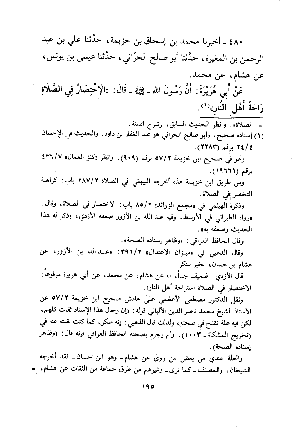 480 - أخبرنا محمد بن إسحاق بن خزيمة، حدَّثنا علي بن عبد الرحمن بن المغيرة، حدَّثنا أبو صالح الحرّاني، حدَّثنا عيسى بن يونس، عن هشام، عن محمد.