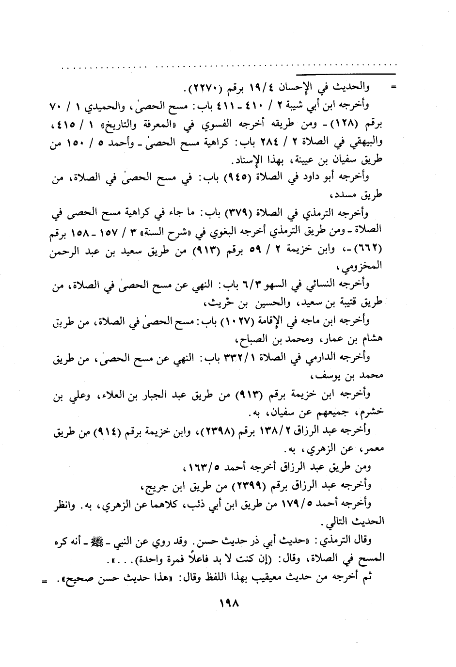 وقال الترمذي: "حديث أبي ذر حديث حسن. وقد روي عن النبي - صلى الله عليه وسلم - أنه كره المسح في الصلاة، وقال: (إن كنت لا بد فاعلاً فمرة واحدة) ... ".