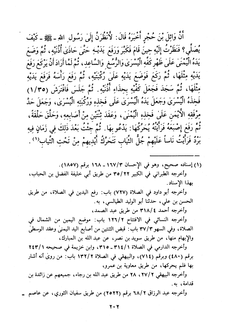 أَنَّ وَائِلَ بْنَ حُجْرٍ أخْبَرَهُ قَالَ: لأنْظُرَنَّ إِلَى رَسُولِ اللهِ - صلى الله عليه وسلم - كَيْفَ يُصَلِّي؟ فَنَظَرْتُ إِلَيْهِ حِينَ قَامَ فَكَبَّرَ وَرَفَعَ يَدَيْةِ حَتَّى حَاذَى أُذُنَيْه، ثُم وَضِعَ يَدَه ُ الْيمْنَى عَلَى ظَهْرِ كَفِّهِ الْيُسْرَى وَالرسُغِ وَالسَّاعِدِ، ثُمّ لَمَّا أَرَادَ أَنْ يَرْكَعَ رَفعَ يَدَيْهِ مِثْلهَا، ثُمَّ رَكَعَ فَوَضَع يَدَيْهِ عَلَى رُكْبَتَيْهِ، ثُمّ رَفَعَ رَأَسَهُ فَرَفَعَ يَدَيْهِ مِثْلَهَا، ثُمّ سَجَدَ فَجَعَلَ كَفَّيْهِ بِحِذَاءِ أُذُنَيْهِ. ثُمّ جَلَس فَافْتَرَشَ (35/ 1) فَخِذَهُ الْيُسْرَي وَجَعَلَ يَدَهُ ألْيُسْرَى عَلَى فَخِذِهِ وَرُكُبَتِهِ الْيُسْرَى، وَجَعَلَ حَدَّ مِرْفَقِهِ الأيْمَنِ عَلَى فَخِذِهِ الْيُمْنَى، وَعَقَدَ ثِنْتَيْنِ مِنْ أَصَابِعِهِ، وَحَلقَ حَلْقَةً، ثُمَّ رَفَعَ إِصْبَعَهُ فَرايْتُهُ يُحَرِّكُهَا: يَدْعُو بِهَا. ثُمّ جِئْتُ بَعْدَ ذلِكَ فِي زَمَانٍ فِيهِ بَرْدٌ فَرأيْتُ نَاساً عَلَيْهِمْ جُلُّ الثِّيَابِ تَتَحَرَّك أيْدِيهِمْ مِنْ تَحْتِ الثَيابِ (¬1).