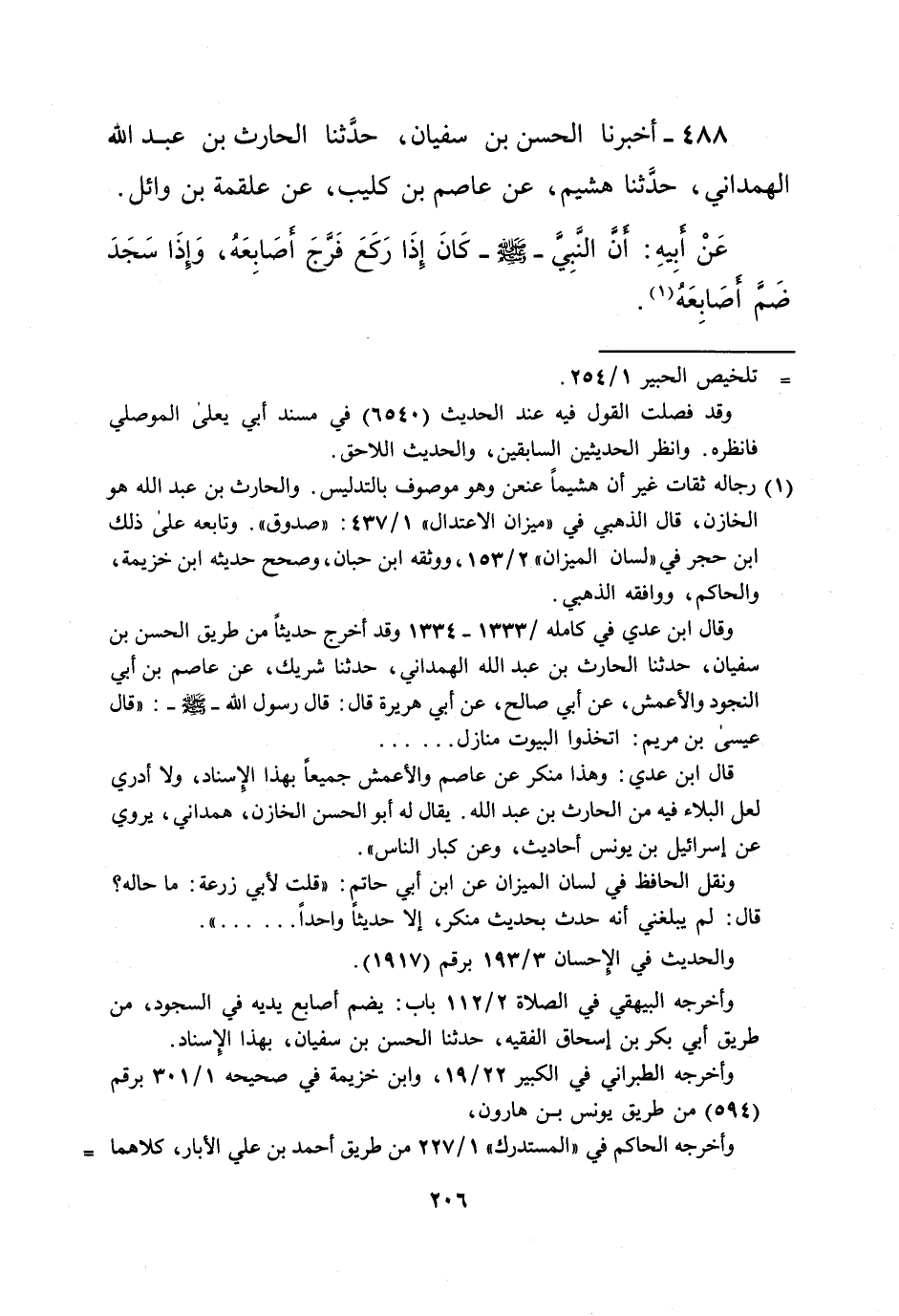 488 - أخبرنا الحسن بن سفيان، حدَّثنا الحارث بن عبد الله الهمداني، حدَّثنا هشيم، عن عاصم بن كليب، عن علقمة بن وائل.