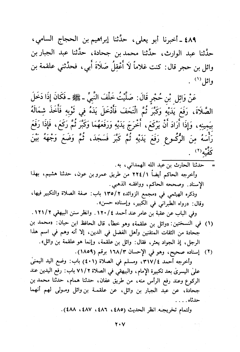 489 - أخبرنا أبو يعلى، حدَّثنا إبراهيم بن الحجاج السامي، حدَّثنا عبد الوارث، حدَّثنا محمد بن جحادة، حدَّثنا عبد الجبار بن وائل بن حجر قال: كنت غلاماً لا أعْقِلُ صَلاةَ أبي، فحدَّثني علقمة بن وائل (¬1).