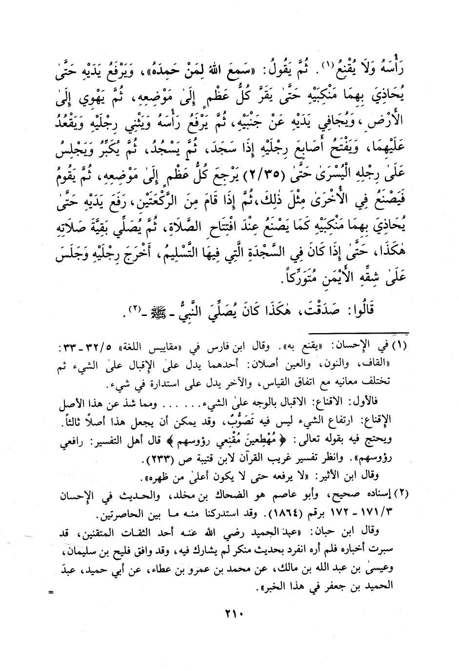 رَأْسَهُ وَلا يُقْنِعُ (¬1). ثُمَّ يَقُولُ: "سَمعَ اللهُ لِمَنْ حَمِدَهُ"، وَيرْفَعُ يَدَيْهِ حَتَّى يُحَاذِيَ بِهِمَا مَنْكِبَيْهِ حَتَّى يَقَرَّ كُل عَظْمٍ إِلَى مَوْضِعِهِ، ثُمّ يَهْوِي إِلَى الأرْضِ، وُيجَافِي يَدَيْهِ عَنْ جَنْبَيْهِ، ثُمَّ يَرْفَعُ رَأْسَهُ وَيثْنِي رِجْلَيْهِ وَيقْعُدُ عَلَيْهِمَا، وَيفْتَحُ أَصَابِع رِجْلَيْهِ إِذَا سَجَدَ، ثُمَّ يَسْجُدُ، ثُمَّ يُكَبِّرُ وَيجْلِسُ عَلَى رِجْلِهِ الْيُسْرَى حَتى (35/ 2) يَرْجِع كُلُّ عَظْمٍ إِلَى مَوْضِعِهِ، ثُمّ يَقُومُ فَيَصْنَعُ فِي الأُخْرَى مِثْلَ ذلِكَ، ثُمَّ إِذَا قَامَ مِنَ الرَّكْعَتَيْنِ، رَفَعَ يَدَيْهِ حَتَّى يُحَاذِيَ بِهِمَا مَنْكِبَيْهِ كَمَا يَصْنَعُ عِنْدَ افْتِتَاحِ الصَّلاة، ثُمّ يصلى بَقِيَّةَ صَلاَتِهِ هكَذَا، حَتَّى إِذَا كَانَ فى السجدة الَّتِي فِيهَا التَّسْلِيمُ، أَخْرَجَ رِجْلَيْهِ وَجَلَسَ عَلَى شِقَهِ الأيْمَنِ مُتَوَرِّكاً.