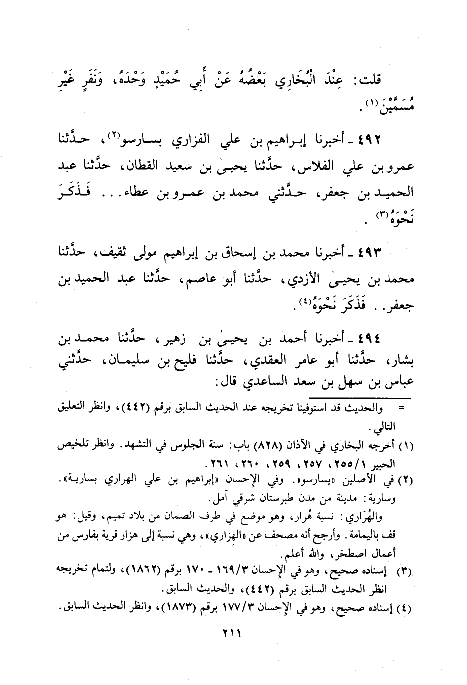 492 - أخبرنا إبراهيم بن علي الفزاري بسارسو (¬2)، حدَّثنا عمرو بن علي الفلاس، حدَّثنا يحيى بن سعيد القطان، حدَّثنا عبد الحميد بن جعفر، حدَّثني محمد بن عمرو بن عطاء ... فذكر نحوهُ (¬3).