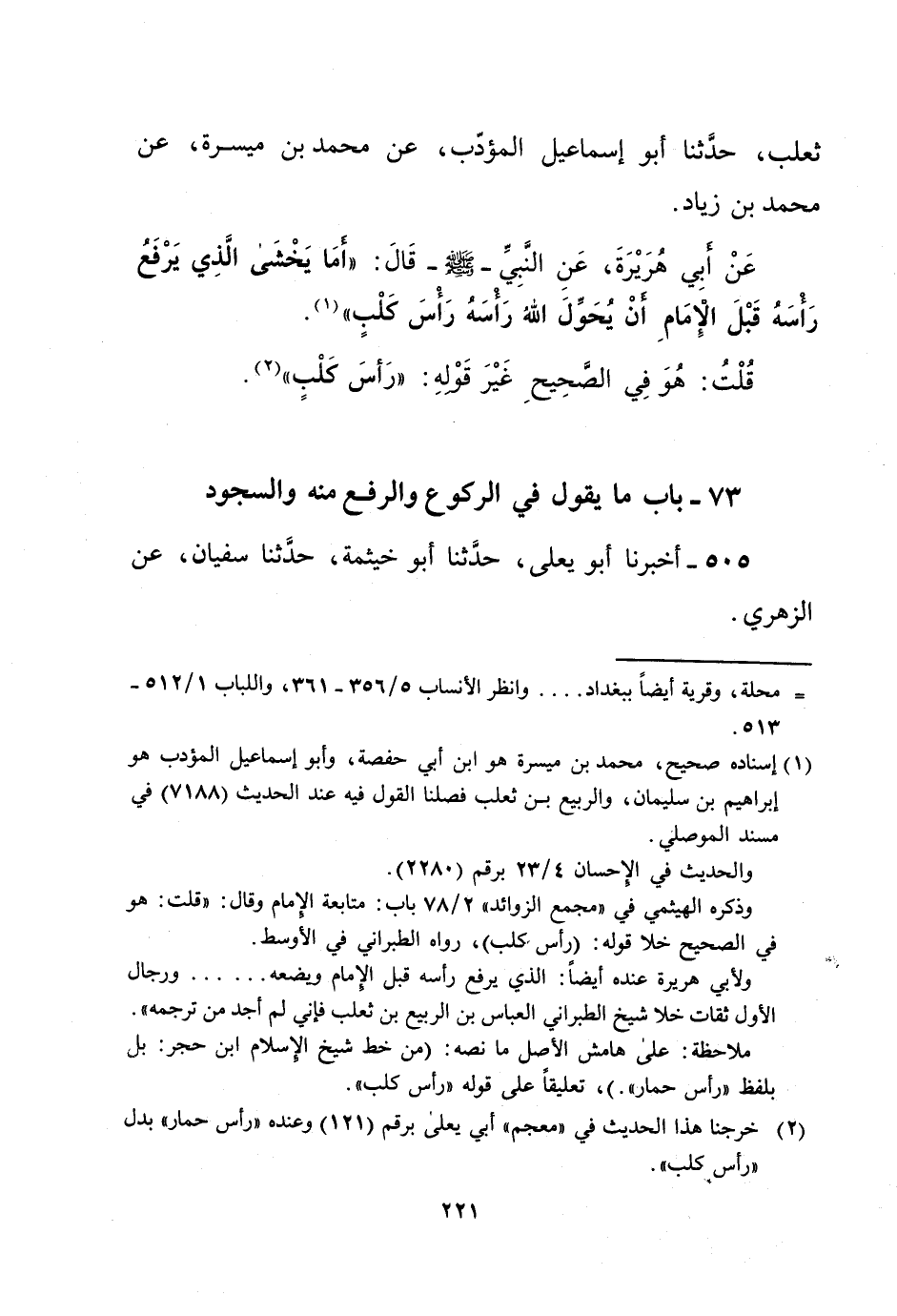 ولأبي هريرة عنده أيضاً: الذي يرفع رأسه قبل الإمام ويضعه ...... ورجال الأول ثقات خلا شيخ الطبراني العباس بن الربيع بن ثعلب فإني لم أجد من ترجمه".