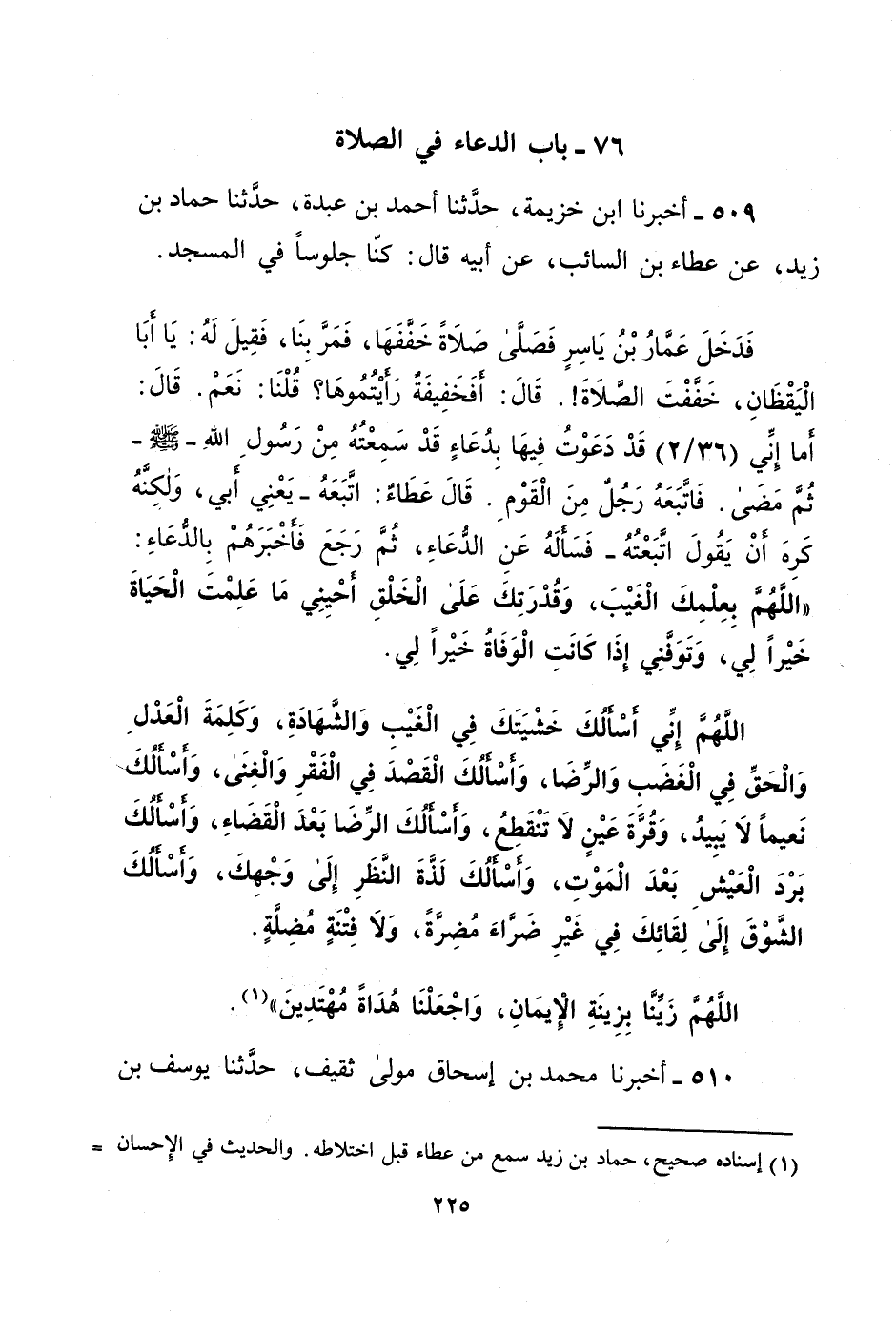 فَدَخَلَ عَمَّارُ بْنُ يَاسِرٍ فَصَلَّى صَلاةً خَفَّفَهَا، فَمَرَّ بِنَا، فَقِيلَ لَهُ: يَا أبَا الْيَقْظَانِ، خَفَّفْتَ الصَّلاةَ!. قَالَ: أفَخَفِيفَةٌ رَأيْتُمُوهَا؟ قُلْنَا: نَعَمْ. قَالَ: أما إنِّي (36/ 2) قَدْ دَعَوْتُ فِيهَا بِدُعَاءٍ قَدْ سَمِعْتُهُ مِنْ رَسُولِ اللهِ - صلى الله عليه وسلم - ثُمَّ مَضَى. فَاتَّبَعَهُ رَخلٌ مِنَ الْقَوْم. قَالَ عَطَاءٌ: اتَّبَعَهُ- يَعْنِي أبي، وَلكِنَّهُ كَرِهَ أنْ يَقُولَ اتَّبَعْتُهُ- فَسَألَهُ عَنِ الدُّعَاءِ، ثُمَّ رَجَعَ فَأخْبَرَهُمْ بِالدُّعَاءِ: "اللَّهُم بِعِلْمِكَ الْغَيْبَ، وَقُدْرَتِكَ عَلَى الْخَلْقِ أحْيِنِي مَا عَلِمْتَ الْحَيَاةَ خَيْراً لِي، وَتَوَفَّنِي إِذَا كَانَتِ الْوَفَاةُ خَيْراً لِي. اللَّهُم إِنِّي أسْألُكَ خَشْيَتَكَ فِي الْغَيْب وَالشَّهَادَةِ، وَكَلِمَةَ الْعَدْلِ وَالْحَقِّ فِي الْغَضب وَالرِّضَا، وَأسْألُكَ الْقَصد فِي الْفَقْرِ وَالْغِنَى، وَأسْألُكَ نَعيماً لا يَبِيدُ، وَقُرًّةَ عَيْنٍ لا تَنْقَطِعُ، وَأسْألُكَ الرِّضَا بَعْدَ الْقَضَاءِ، وَأسْألُكَ بَرْدَ الْعَيْشِ بَعْدَ الْمَوْتِ، وَأسْألُكَ لَذَّةَ النَّظَرِ إِلَى وَجْهِكَ، وَأسْألكَ الشَّوْقَ إِلَى لِقَائِكَ فِي غيْرِ ضَرَّاءَ مُضِرَّةً، وَلا فِتْنَةٍ مُضِلَّةٍ. اللَّهُمَّ زَيِّنَّا بِزِينَةِ الإِيمَانِ، وَاجْعَلْنَا هُدَاةً مُهْتَدِينَ" (¬1).