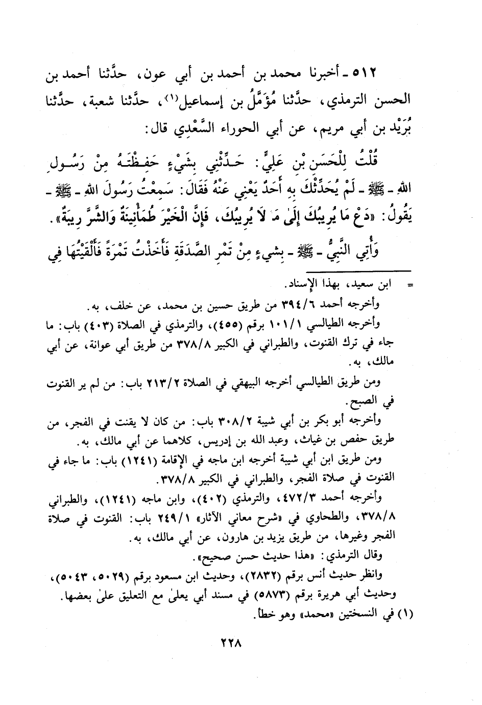 512 - أخبرنا محمد بن أحمد بن أبي عون، حدَّثنا أحمد بن الحسن الترمذي، حدَّثنا مُؤَمَّلُ بن إسماعيل (¬1)، حدَّثنا شعبة، حدَّثنا يُرَيْد بن أبي مريم، عن أبي الحوراء السَّعْدِي قال: