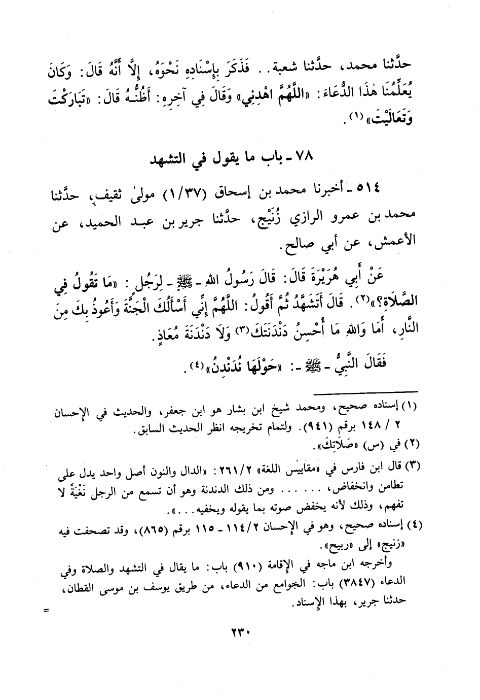 عَنْ أبِي هُرَيْرَةَ قَالَ: قَالَ رَسُولُ الله - صلى الله عليه وسلم - لِرَجُلَ: "مَا تَقُولُ فِي الصَّلاَةِ؟ " (¬2). قَالَ أَتَشَهَّدُ ثُمَّ أَقُولُ: اللَّهُمَّ إِنِّي أَسْأَلُكَ الْجَنَّةَ وَأَعُوذُ بِكَ مِنَ النَّارِ، أمَا وَاللِه مَا أُحْسِنُ دَنْدَنَتَكَ (¬3) وَلاَ دَنْدَنَةَ مُعَاذٍ.