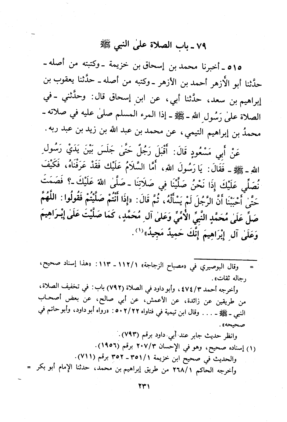 515 - أخبرنا محمد بن إسحاق بن خزيمة- وكتبته من أصله- حدَّثنا أبو الأَزهر أحمد بن الأزهر- وكتبه من أصله- حدَّثنا يعقوب بن إبراهيم بن سعد، حدَّثنا أبي، عن ابن إسحاق قال: وحدَّثني- في الصلاة على رَسُولِ اللهِ - صلى الله عليه وسلم - إذا المرء المسلم صلى عليه في صلاته- محمدُ بن إبراهيم التيمي، عن محمد بن عبد الله بن زيد بن عبد ربه.