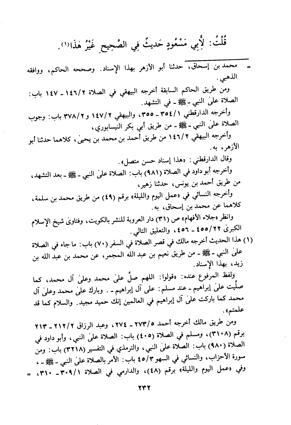 (¬1) هذا الحديث أخرجه مالك في قصر الصلاة في السفر (70) باب: ما جاء في الصلاة على النبي - صلى الله عليه وسلم - من طريق نعيم بن عبد الله المجمر، عن محمد بن عبد الله بن زيد، بهذا الإسناد. وَلفظ المرفوع عنده: "قولوا: اللهم صل على محمد وعلى آل محمد، كما صليت على إبراهيم- عند مسلم: على آل إبراهيم-. وبارك على محمد وعلى آل محمد كما باركت على آل إبراهيم في العالمين إنك حميد مجيد. والسلام كما قد علمتم". ومن طريق مالك أخرجه أحمد 5/ 273 - 274، وعبد الرزاق 2/ 212 - 213 برقم (3108)، ومسلم في الصلاة (405) باب: الصلاة على النبي، وأبو داود في الصلاة (980) باب: الصلاة على النبي، والترمذي في التفسير (3218) باب: ومن سورة الأحزاب، والنسائي في السهو 3/ 45 باب: الأمر بالصلاة على النبي-صلى الله عليه وسلم-، وفي "عمل اليوم والليلة" برقم (48)، والدارمي في الصلاة 1/ 309 - 310، =