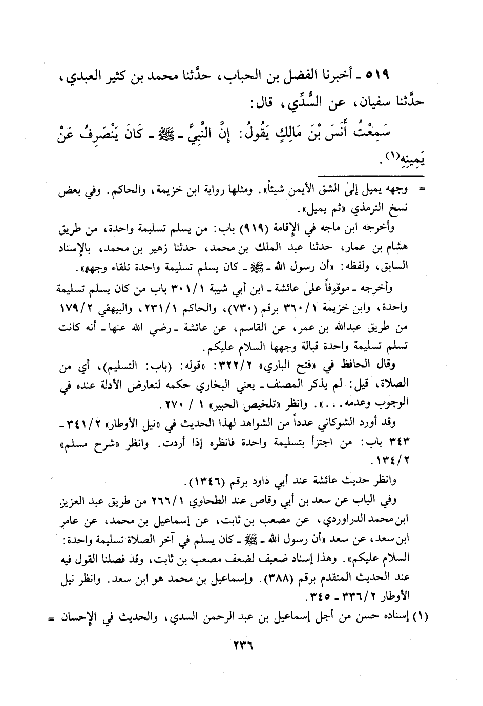 سَمِعْتُ أَنَسَ بْنَ مَالِكٍ يَقُولُ: إِنَّ النَّبِيَّ - صلى الله عليه وسلم - كَانَ يَنْصَرِفُ عَنْ يَمِينِهِ (¬1).