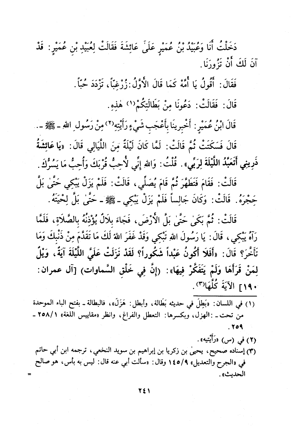 دَخَلْتُ أنَا وَعُبَيْدُ بْنُ عُمَيْرٍ عَلَىَ عَائِشَةَ فَقَالَتْ لِعُبَيْدِ بْنِ عُمَيْرٍ: قَدْ آنَ لَكَ أنْ تَزُورَنَا. فَقَالَ: أقُولُ يَا أُمَّهْ كَمَا قَالَ الأوَّلُ: زُرْ غِبّاً، تَزْدَدَ حُبّاً. قَالَ: فَقَالَتْ: دَعُونَا مِنْ بَطَالَتِكُمْ (¬1) هذِهِ. قَالَ ابْنُ عُمَيْرٍ: أَخْبِرينَا بِأَعْجَبِ شَيْءٍ رَأَيْتِهِ (¬2) مِنْ رَسُولِ اللهِ - صلى الله عليه وسلم -. قَالَ فَسَكَتَتْ ثُمَّ قَالَتْ: لَمَّا كَانَ لَيْلَةٌ مِنَ اللَّيَالِي قَالَ: "يَا عَائِشةُ ذَرِينِي أَتَعَبَّدُ اللَّيْلَةَ لِرَبِّي". قُلْتُ: والله إِنِّي لأُحِبُّ قُرْبَكَ وَأُحِبُّ مَا يَسُرُّكَ. قَالَتْ: فَقَامَ فَتَطَهَّرَ ثُمَّ قَامَ يُصَلِّي، قَالَتْ: فَلَمْ يَزَلْ يَبْكِي حَتَّى بَلَّ حِجْرَهُ. قَالَتْ: وَكَانَ جَالِساً فَلَمْ يَزَلْ يَبْكِي - صلى الله عليه وسلم - حَتَّى بَلَّ لِحْيَتَهُ. قَالَتْ: ثُمَّ بَكَى حَتَّى بَلَّ الأرْضَ، فَجَاءَ بِلاَلٌ يُؤْذِنُهُ بِالصَّلاَةِ، فَلَمَّا رَآهُ يَبْكِي، قَالَ: يَا رَسُولَ الله تَبْكِي وَقَدْ غَفَرَ الله لَكَ مَا تَقَدَّمَ مِنْ ذَنْبِكَ وَمَا تَأَخَّرَ؟ قَالَ: "أَفَلاَ أكُونُ عَبْداً شَكُوراً؟ لَقَدْ نَزَلَتْ عَلَيَّ اللَّيْلَةَ آيَة، وَيْل لِمَنْ قَرَأَهَا وَلَمْ يَتَفَكَّرْ فِيهَا": {إِنَّ فِي خَلْقِ السَّماوات} [آل عمران: 190] الآيَةَ كُلَّهَا (¬3).