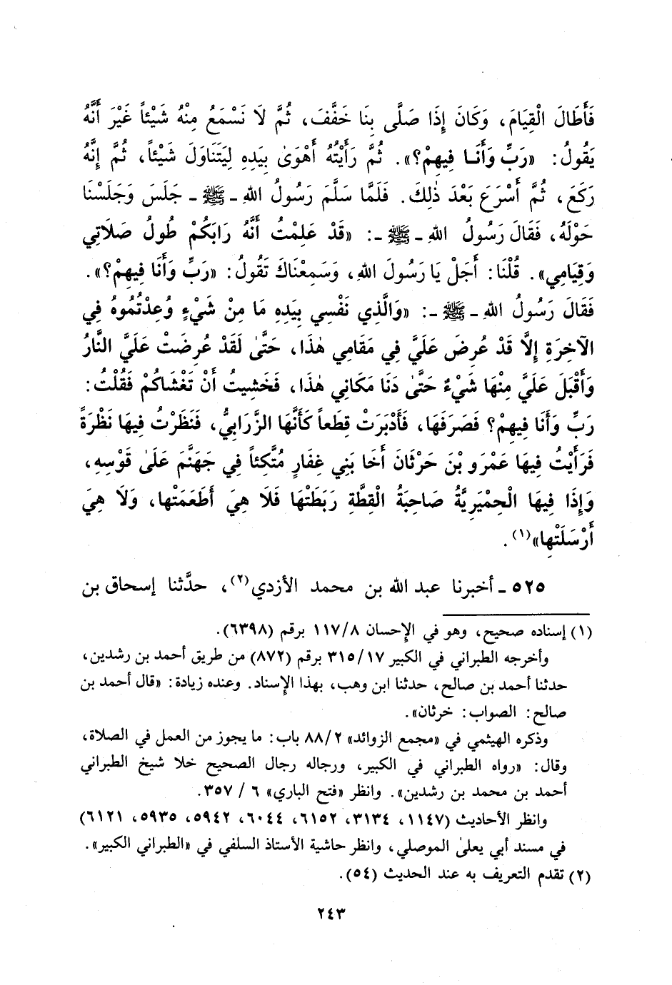 فَأطَالَ الْقِيَامَ، وَكَانَ إِذَا صَلَّى بنَا خَفَّفَ، ثُمَّ لاَ نَسْمَعُ مِنْهُ شَيْئاً غَيْرَ أنَّهُ يَقُولُ:"رَبِّ وَأنَا فِيهمْ؟ ". ثُمًّ رَأيْتُهُ أهْوَى بِيَدِهِ لِيَتَنَاوَلَ شَيْئاً، ثُمَّ إِنَّهُ رَكَعَ، ثُمَّ أسْرَعَ بَعْدَ ذَلِكَ. فَلَمَّا سَلَّمَ رَسُولُ اللهِ - صلى الله عليه وسلم - جَلَسَ وَجَلَسْنَا حَوْلَهُ، فَقَالَ رَسُولُ اللهِ - صلى الله عليه وسلم -: "قَدْ عَلِمْتُ أنَّهُ رَابَكُمْ طُولُ صَلاتِي وَقِيَامِي". قُلْنَا: أجَلْ يَا رَسُولَ اللهِ، وَسَمِعْنَاكَ تَقُولُ: "رَبِّ وَأنَا فِيهِمْ؟ ". فَقَالَ رَسُولُ اللهِ - صلى الله عليه وسلم -: "وَالَّذِي نَفْسِي بِيَدِهِ مَا مِنْ شَيْءٍ وُعِدْتُمُوهُ فِي الآخِرَةِ إِلاَّ قَدْ عُرِضَ عَلَيَّ فِي مَقَامِي هذَا، حَتَّى لَقَدْ عُرِضَتْ عَلَيَّ النَّارُ وَأقْبَلَ عَلَيَّ مِنْهَا شَيْءٌ حَتَّى دَنَا مَكَانِي هذَا، فَخَشِيتُ أنْ تَغْشَاكُمْ فَقُلْتُ: رَبِّ وَأَنَا فِيهِمْ؟ فَصَرَفَهَا، فَأَدْبَرَتْ قِطَعاً كَأَنَّهَا الزَّرَابِيُّ، فَنَظَرْتُ فِيهَا نَظْرَةً فَرَأيْتُ فِيهَا عَمْرَو بْنَ حَرْثَانَ أخَا بَنِي غِفَارٍ مُتَّكِئاً فِي جَهَنَّمَ عَلَى قَوْسِهِ، وَإِذَا فِيهَا الحِمْيَريَّهُ صَاحِبَةُ الْقِطَّةِ رَبَطَتْهَا فَلا هِيَ أطَعَمَتْها، وَلاَ هِيَ أرْسَلَتْهِا" (¬1).
