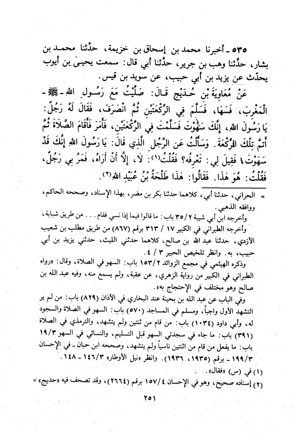 عَنْ مُعَاوِيةَ بْنِ حُدَيْج قَالَ: صَلَّيْتُ مَعَ رَسُولِ اللهِ - صلى الله عليه وسلم - الْمَغْرِبَ، فَسَهَا، فَسَلَّمَ فِي الرَّكْعَتَيْنِ ثُمَّ انْصَرَفَ، فَقَالَ لَهُ رَجُلٌ: يَا رَسُولَ الله، إنَّكَ سَهَوْتَ فَسَلَّمتَ فِي الرَّكْعَتَيْنِ، فَأمَرَ فَأقَامَ الصَّلاةَ ثُمَّ أتم. "تِلْكَ الركعةَ. وَسَألْتُ عَن الرَّجُلِ الّذِي قَالَ؟ يَا رَسُولَ الله إنَّكَ قَدْ سَهَوْتَ فَقِيلَ لِي: تَعْرِفُه؟ فَقُلْتُ (¬1): لا، إِلاَّ أَنْ أَرَاهُ، فَمَرَّ بِي رَجُلٌ، فَقُلْتُ: هُوَ هذَا. فَقَالُوا: هذَا طَلْحَةُ بْنُ عُبَيْدِ اللهِ (¬2).
