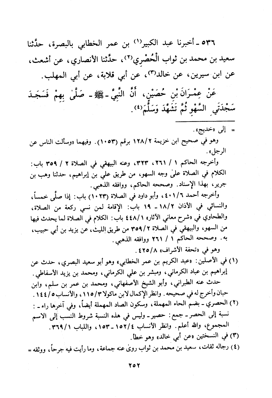 536 - أخبرنا عبد الكبير (¬1) بن عمر الخطابي بالبصرة، حدَّثنا سعيد بن محمد بن ثواب الْحُصْرِي (¬2)، حدثنا الأنصاري، عن أشعث، عن ابن سيرين، عن خالد (¬3)، عن أبي قلابة، عن أبي المهلب.