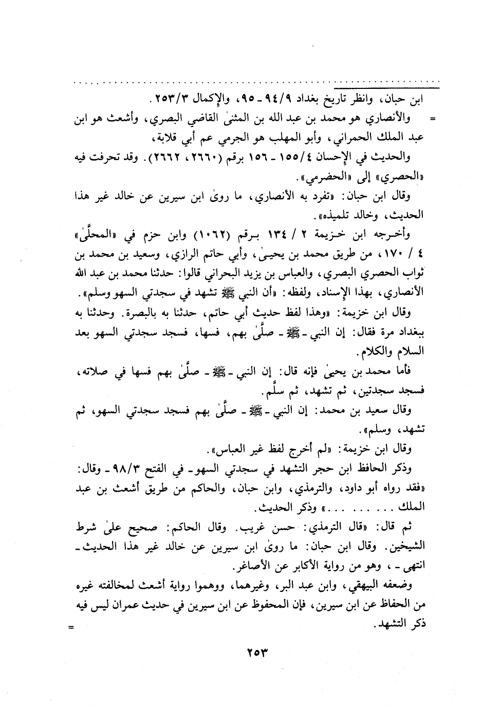 وقال ابن خزيمة:، وهذا لفظ حديث أبي حاتم، حدثنا به بالبصرة. وحدثنا به ببغداد مرة فقال: إن النبي- صلى الله عليه وسلم- صلى بهم، فسها، فسجد سجدتي السهو بعد السلام والكلام.