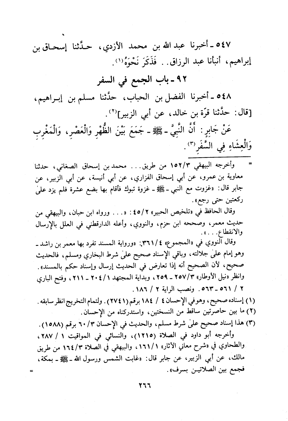 عَنْ جَابِرٍ: أَنَّ النَّبِيَّ - صلى الله عليه وسلم - جَمَعَ بَيْنَ الظُّهْرِ وَالْعَصْرِ، وَالْمَغْرِب وَالْعِشَاءِ فِي السفر (¬3).