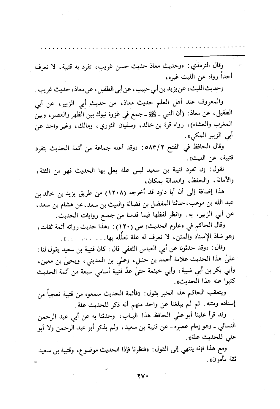 = وقال الترمذي: "وحديث معاذ حديث حسن غريب، تفرد به قتيبة، لا نعرف أحداً رواه عن الليث غيره،