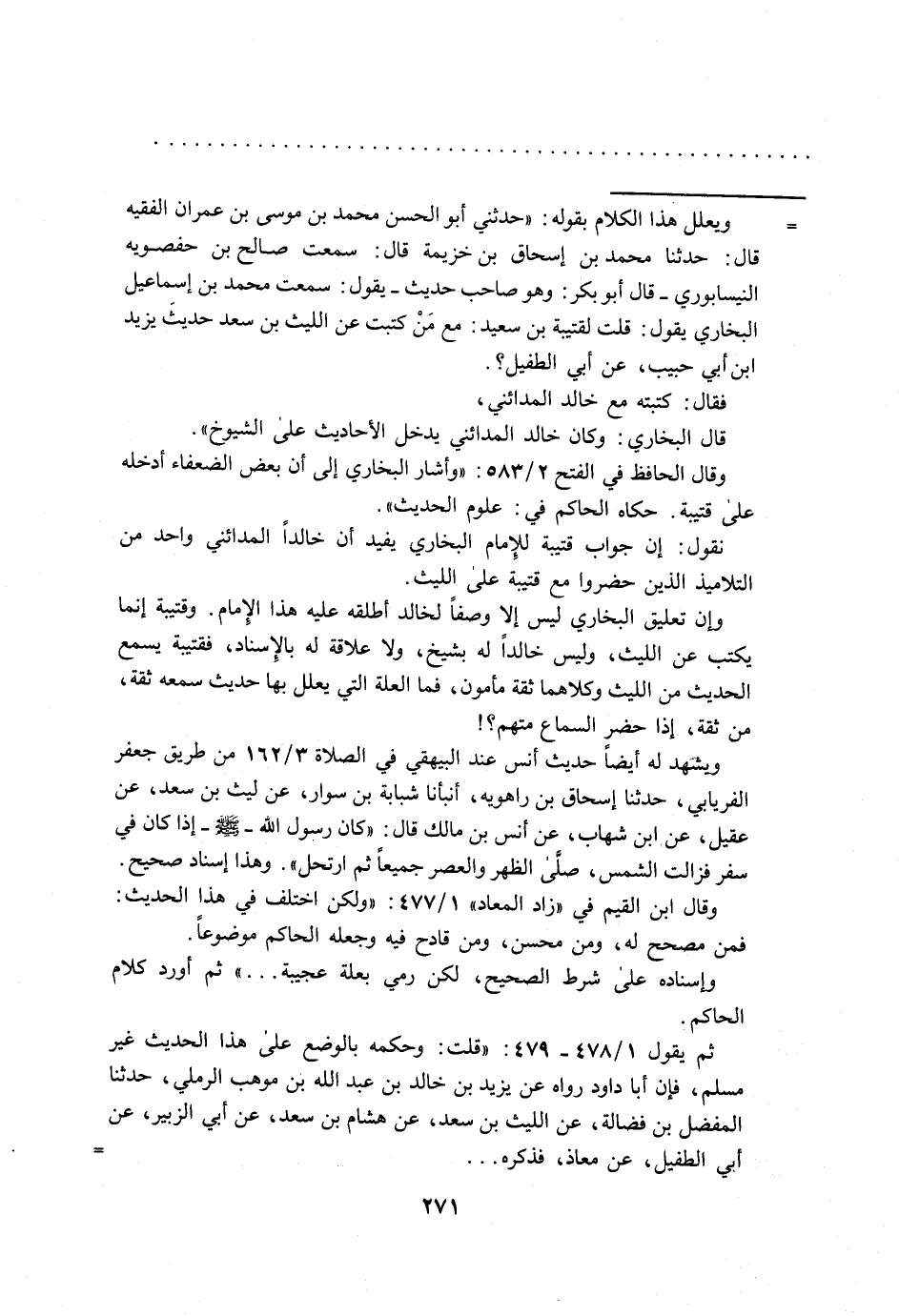 = ويعلل هذا الكلام بقوله: "حدثني أبو الحسن محمد بن موسى بن عمران الفقيه قال: حدثنا محمد بن إسحاق بن خزيمة قال: سمعت صالح بن حفصويه النيسابوري- قال أبو بكر: وهو صاحب حديث- يقول: سمعت محمد بن إسماعيل البخاري يقول: قلت لقتيبة بن سعيد: مع مَنْ كتبت عن الليث بن سعد حديثَ يزيد ابن أبي حبيب، عن أبي الطفيل؟.