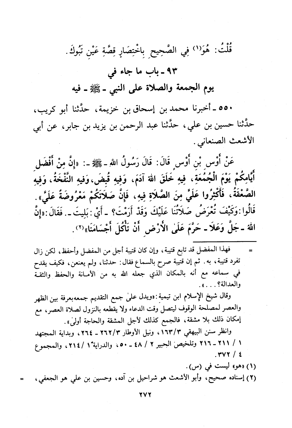 550 - أخبرنا محمد بن إسحاق بن خزيمة، حدَّثنا أبو غريب، حدَّثنا حسين بن علي، حدَّثنا عبد الرحمن بن يزيد بن جابر، عن أبي الأشعث الصنعاني.