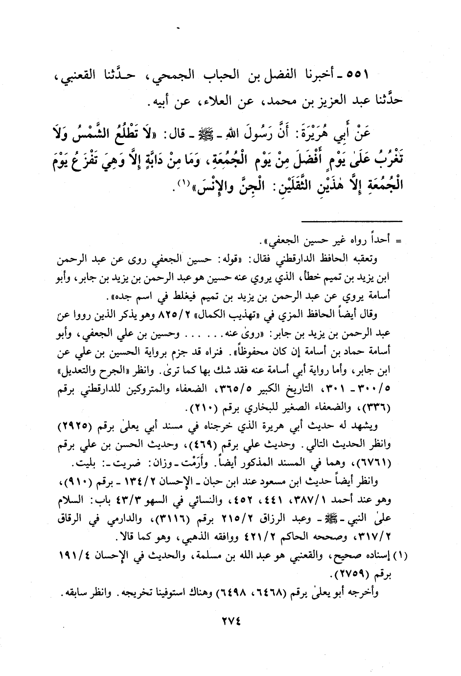 551 - أخبرنا الفضل بن الحباب الجمحي، حدَّثنا القعنبي، حدَّثنا عبد العزيز بن محمد، عن العلاء، عن أبيه.